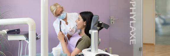 Zunächst untersuchen wir Ihr Gebiss gründlich. Daraufhin werden die Beläge auf Ihren Zahnoberflächen, in den Zahnzwischenräumen und in den Zahnfleischtaschen entfernt. Mithilfe modernster Technik, wie dem Air-Flow (Pulverstrahlgerät) in Kombination mit Poliermittel können selbst starke Verfärbungen entfernt werden. Mithilfe von verschiedenen Handinstrumenten, kleinen Bürstchen und Zahnseide werden im Anschluss weiche Ablagerungen entfernt. Zum Schluss werden die gereinigten Zahnflächen mit einem Fluorid-Lack überzogen, damit diese vor Säureattacken der Mundbakterien geschützt sind. Unsere professionellen Prophylaxe- Assistent:innen beraten Sie außerdem gerne zur richtigen Zahnpflege zu Hause.